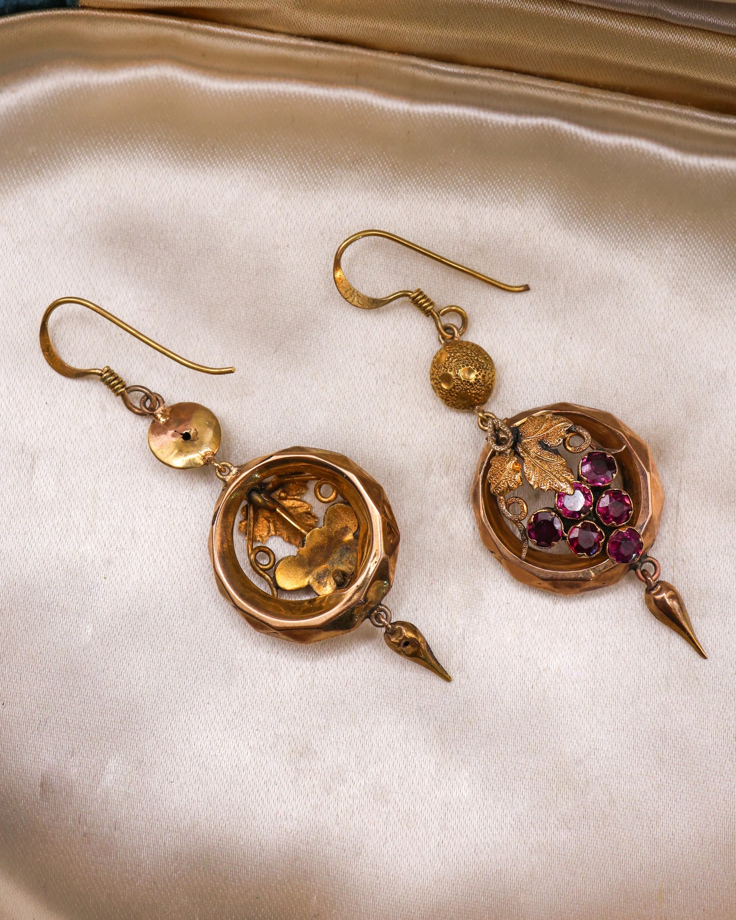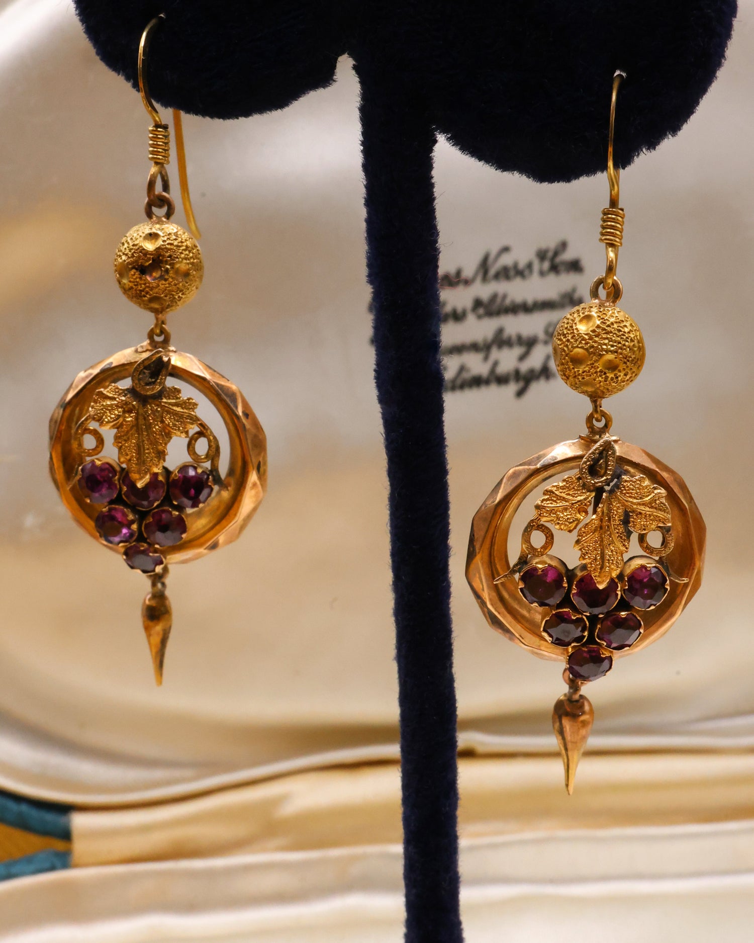 A beautiful pair of Late Victorian 9 Ct. Yellow Gold (tested), Almandine Garnet Drop Earrings with Etruscan Revival & Bacchanalian influences. A half spherical drop in moonscape gold design suspending an articulated open circle of faceted gold, in turn supporting the finely chased Bacchanalian grape leaf design. Each earring is rub-over set with six Almandine Garnets (representing Grapes). An articulated reverse steeple shaped drop is suspended from the bottom and both earrings have matching Shepherd's Crook fittings.