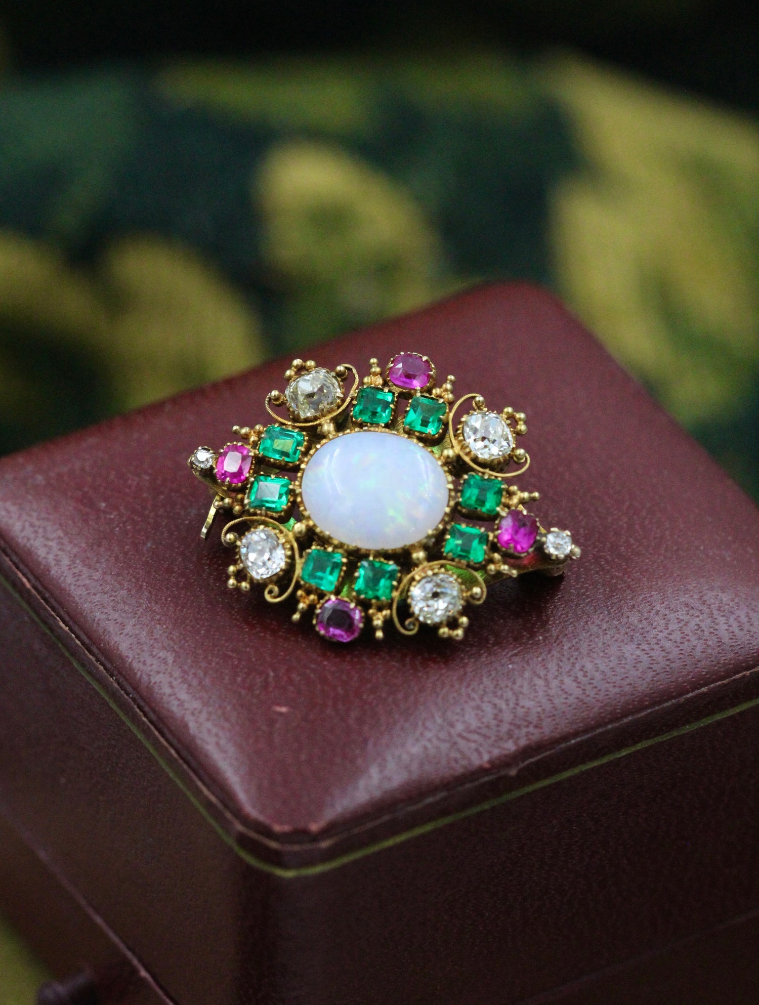 A very finely worked Antique Opal, Colombian Emerald, Burmese Ruby & Diamond, 18ct Yellow Gold Brooch, attributed to Harvey & Gore. Circa 1890.