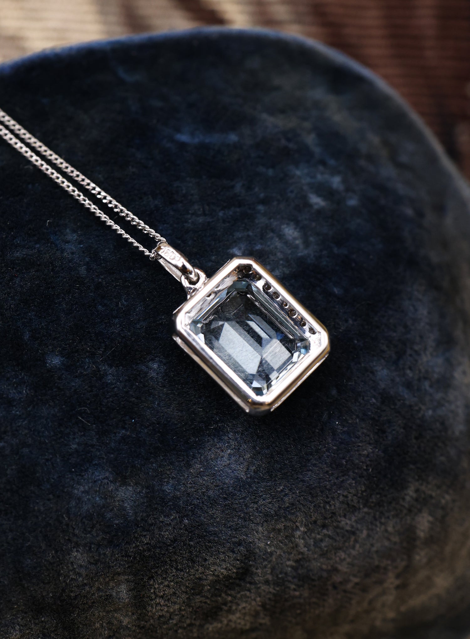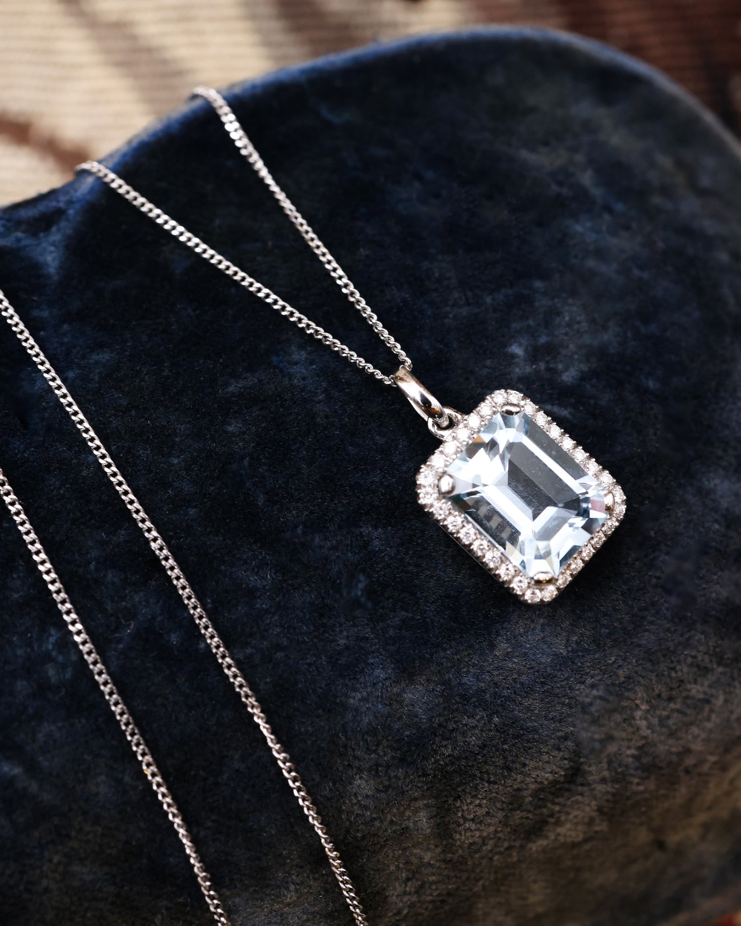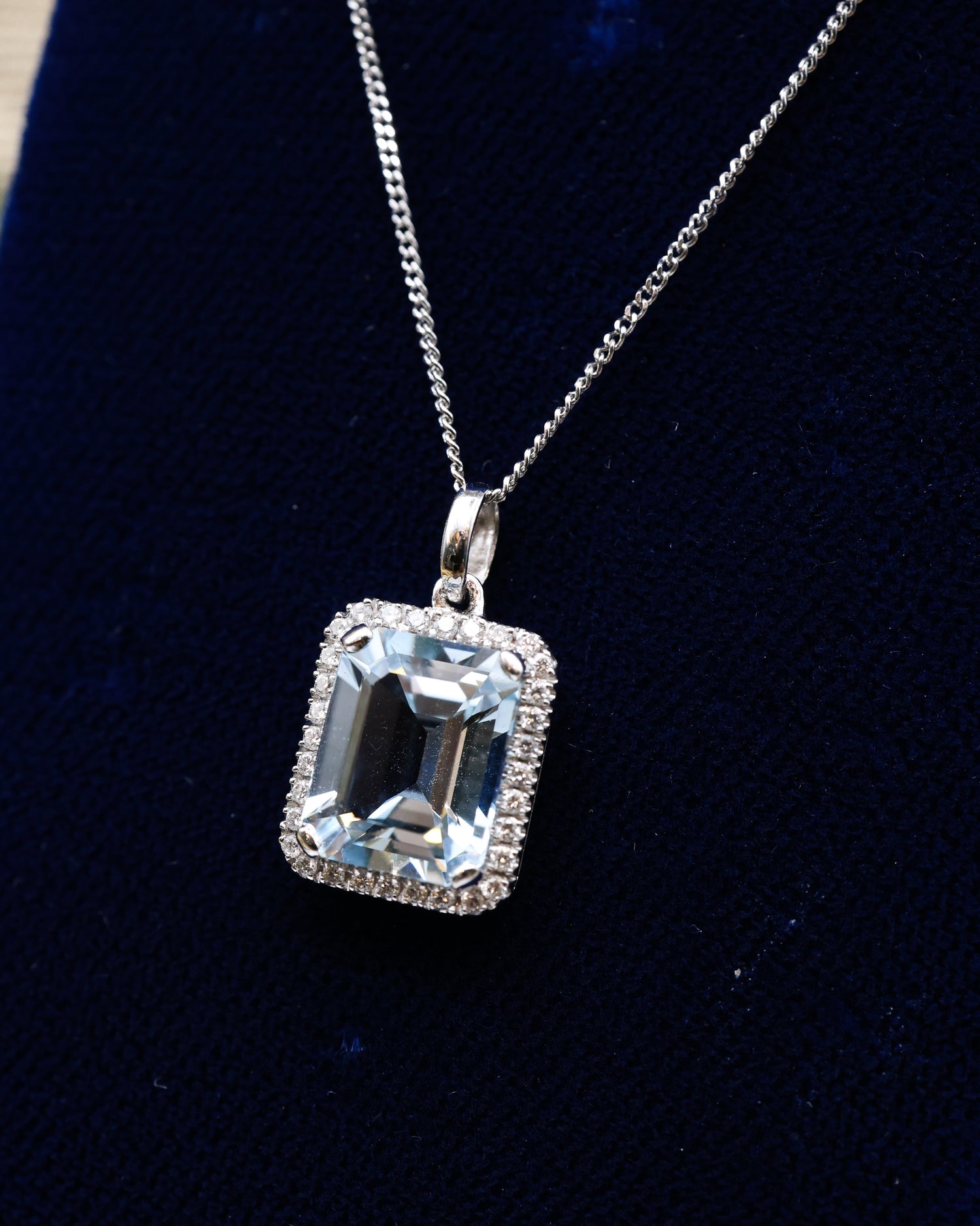 A very fine 18ct White Gold (stamped), Aquamarine & Diamond Pendant with an 18ct White Gold Chain. Pre-owned.